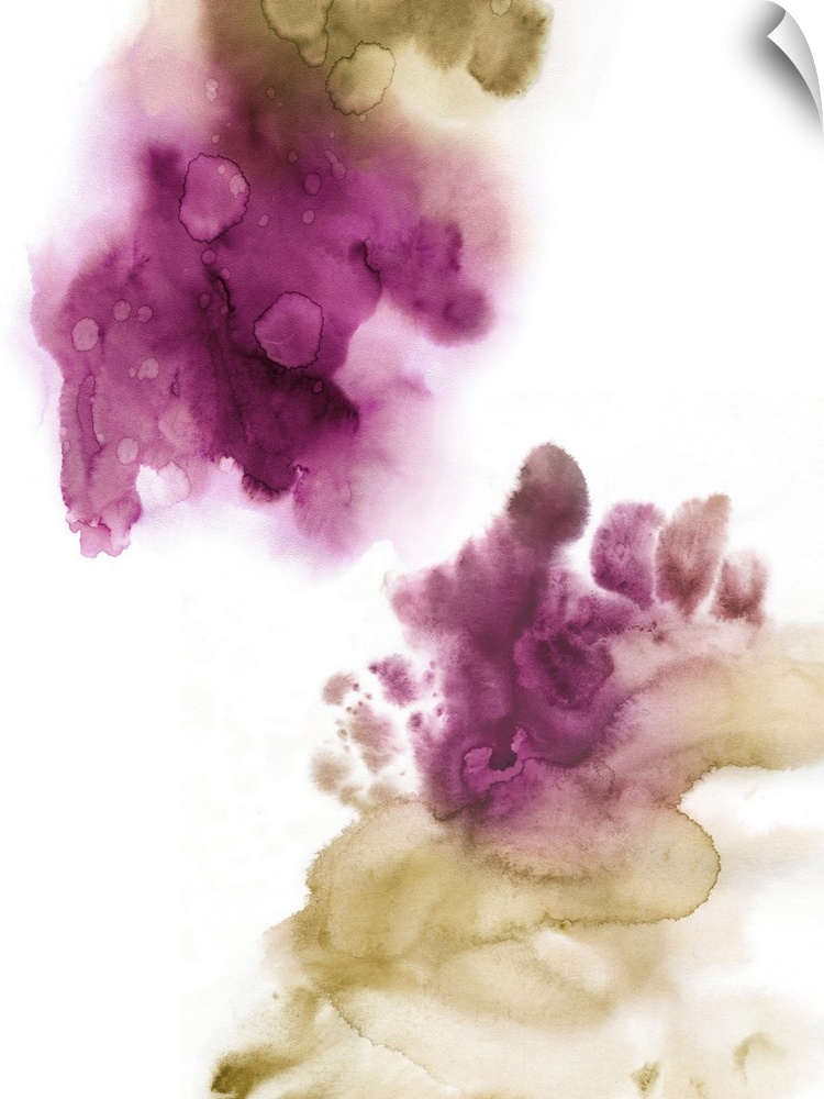 <p>Abstract painting with fuchsia and gold hues splattered together on a white background.</p>