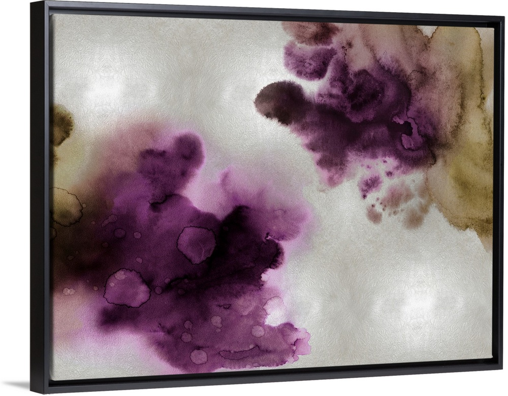 <p>Abstract painting with deep purple and gold hues splattered together on a silver background.</p>
