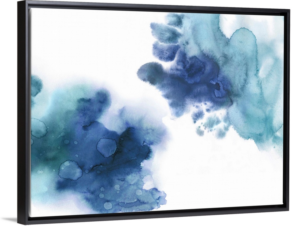 <p>Abstract painting with shades of blue splattered together on a white background.</p>