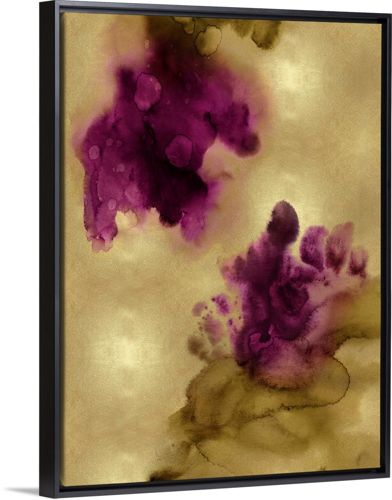 <p>Abstract painting with fuchsia hues splattered together on a gold background.</p>