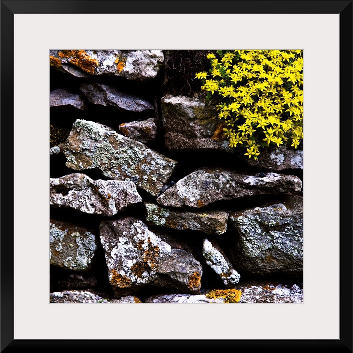 <p>A detailled close-up of an English dry-stone wall with lichen covered rocks and a beautiful yellow flowered plant growing amongst the rocks.</p>