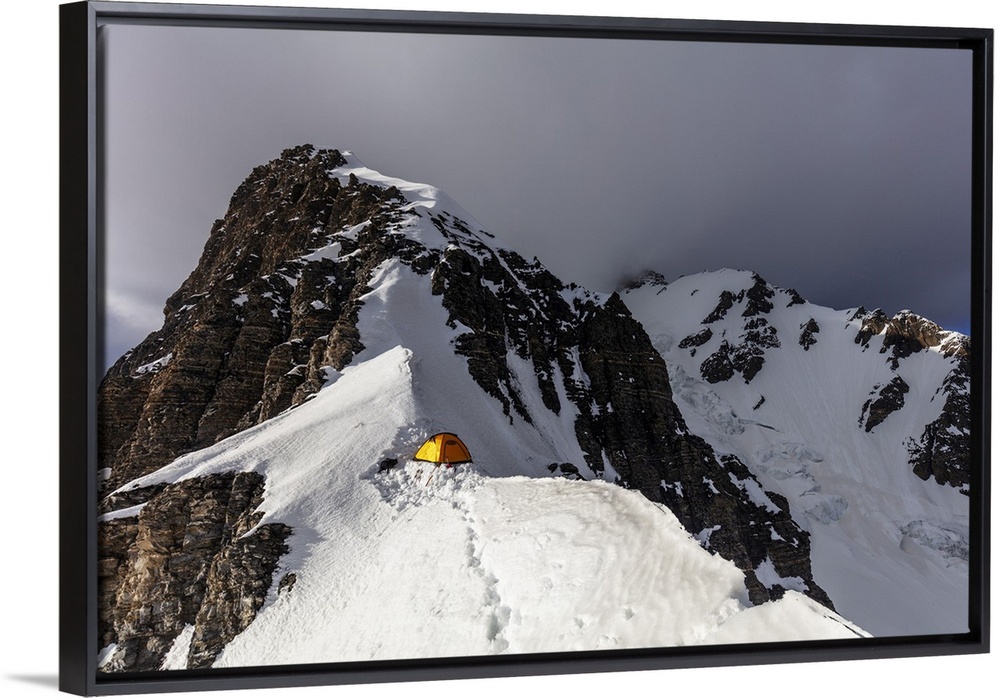 <p>Tent at Camp 4 at 6100m on Peak Korzhenevskaya, 7105m, at sunset, Tajik National Park (Mountains of the Pamirs), UNESCO World Heritage Site, Tajikistan, Central Asia, Asia</p>