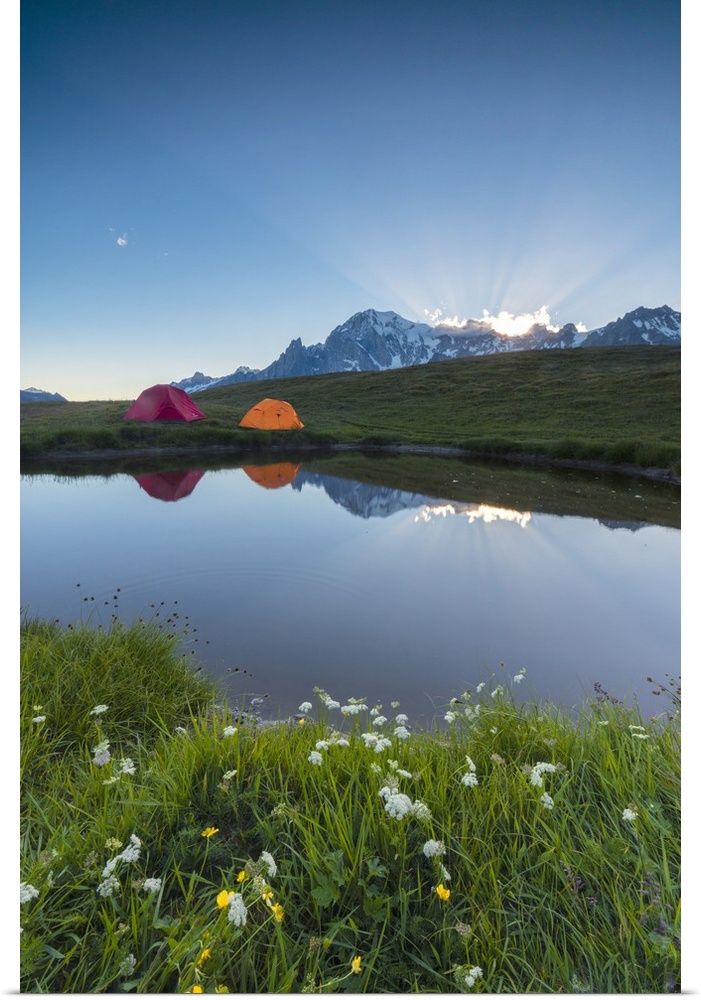 <p>Camping tents in the green meadows surrounded by flowers and alpine lake, Mont De La Saxe, Courmayeur, Aosta Valley, Italy</p>