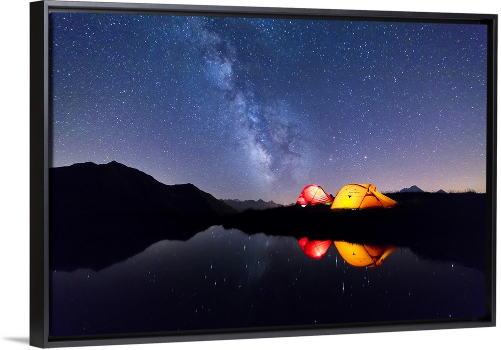<p>Tents reflected in the alpine lake on a starry night, Mont De La Saxe, Courmayeur, Aosta Valley, Italy</p>