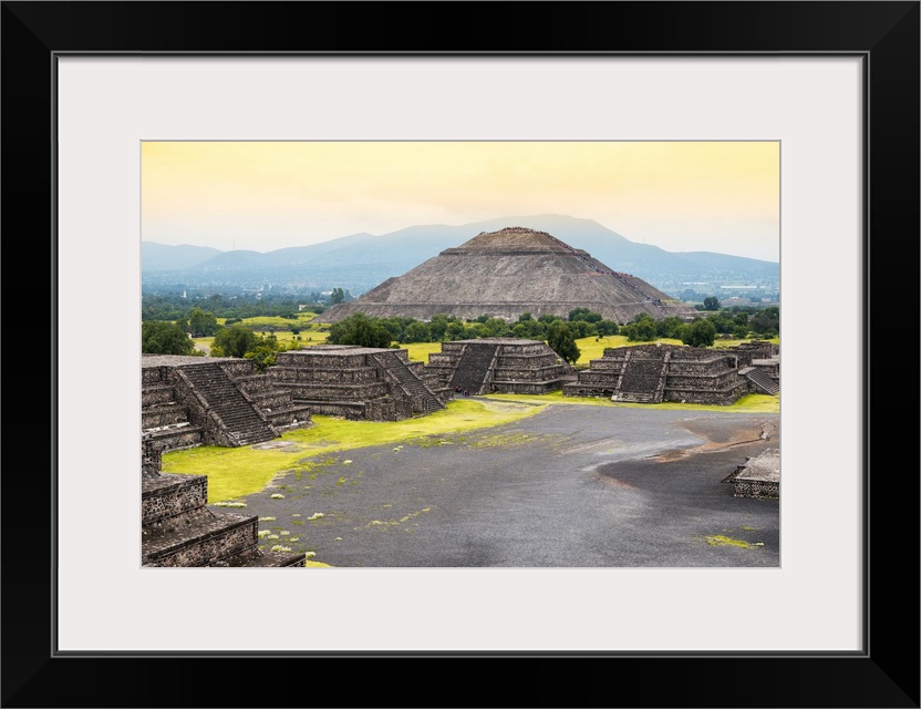 <p>Photograph of the ancient pyramids in Teotihuacan, Mexico, featuring the Pyramid of the Sun and a warm sky. From the Viva Mexico Collection.</p>