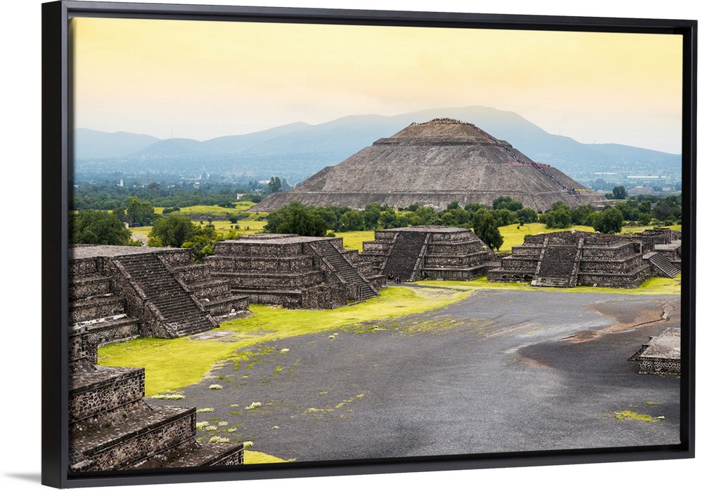 <p>Photograph of the ancient pyramids in Teotihuacan, Mexico, featuring the Pyramid of the Sun and a warm sky. From the Viva Mexico Collection.</p>