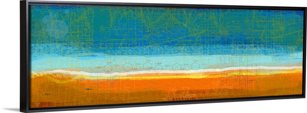 <p>Nature inspired and digitally created. This panoramic shaped artwork is comprised to swaths of color that give the impression of a desert and an endless sky above. Over this a topographic map, technical drawings, and chemical compounds have been layered.</p>