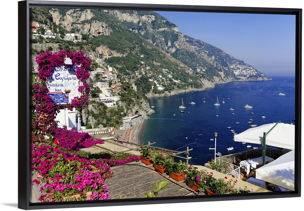 <p>High Angle View of a Beach and Coast from a Hillside Terrace, Positano</p>