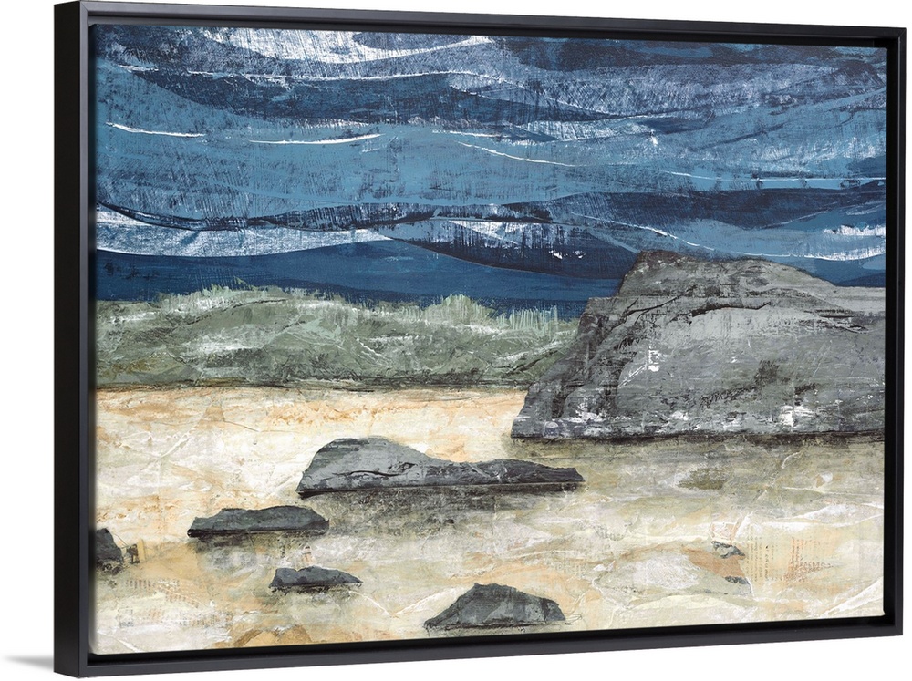 <p>Abstract landscape painting with a rocky ground and a wavy blue sky.</p>
