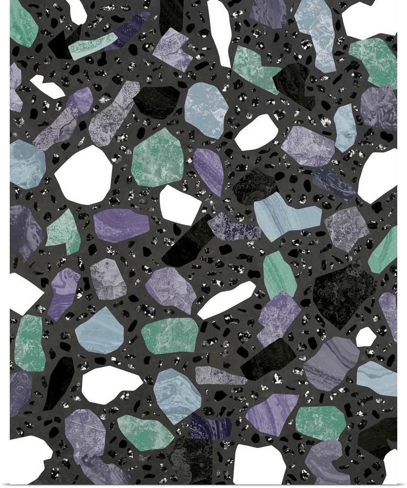 <p>A contemporary abstract design featuring organic shapes in shades of purple, blue and green on a grey background that resembles natural stone.</p>