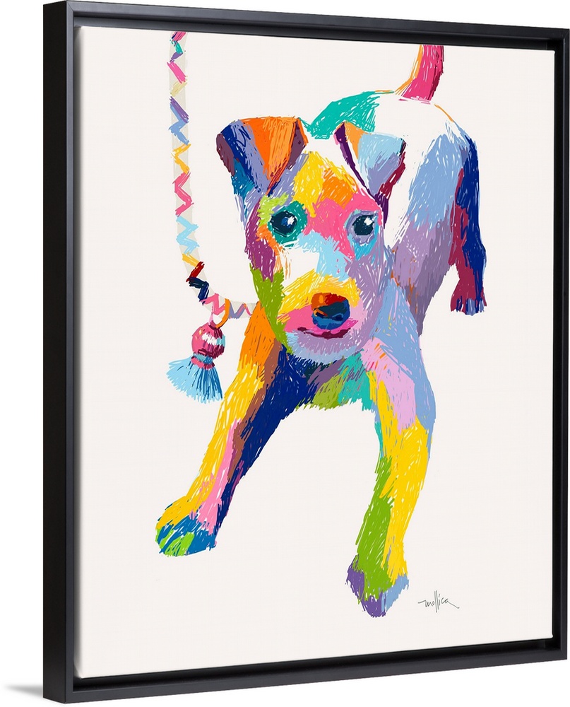 <p>Colorful sketch of a terrier in bright colors on a leash, looking poised and ready to play.</p>