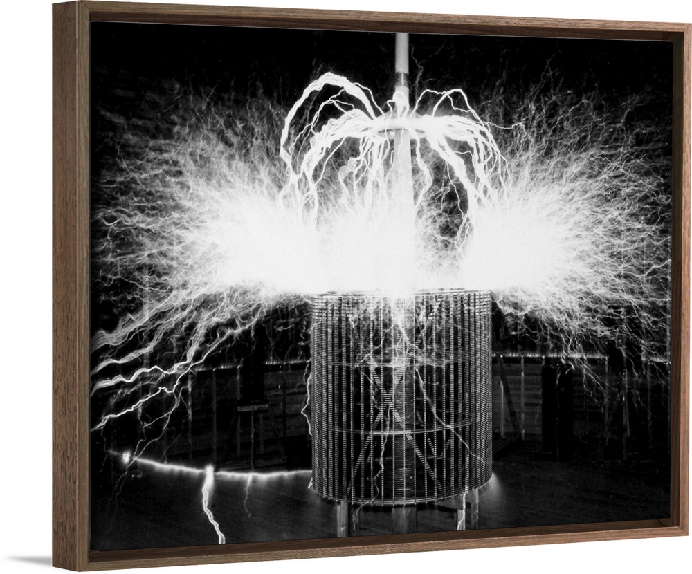 <p>Tesla coil experiment. Electrical streamers sparking outwards from a coil at the laboratory operated by Serb-US physicist and electrical engineer Nikola Tesla (1856-1943) at Colorado Springs, Colorado, USA. Tesla operated this laboratory from 1899 to 1900. Here, the 12-million-volt discharge of an electrical oscillator has caused the nitrogen and oxygen in the air to burn in a flame-like display 20 metres across. The coil named after Tesla is a type of resonant transformer that is used to produce high-voltage, low-current, high-frequency alternating current electricity. Tesla's research led to key advances in areas such as alternating current power generation and transmission. The SI unit of magnetic flux density is named in his honour.</p>