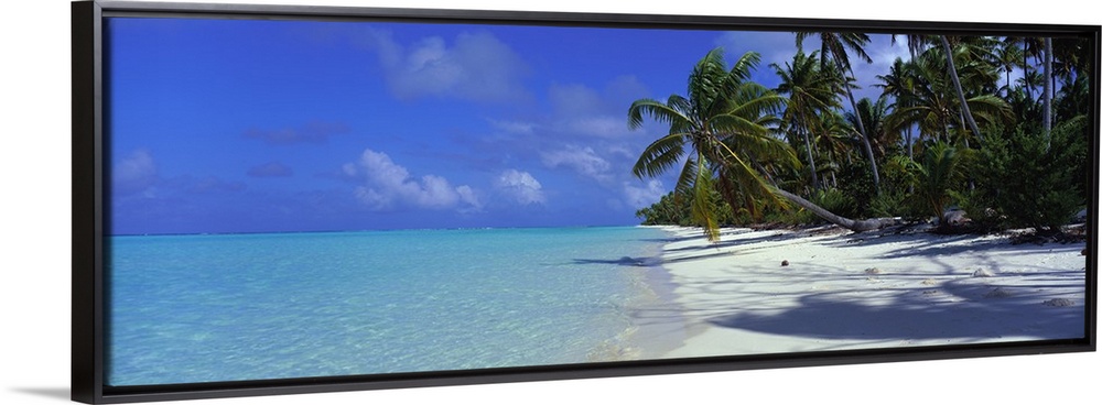 <p>Big panoramic photo of palm trees on a white sand beach with the water trickling onto the shore in the Tetiaroa Atoll, French Polynesia, Tahiti.</p>