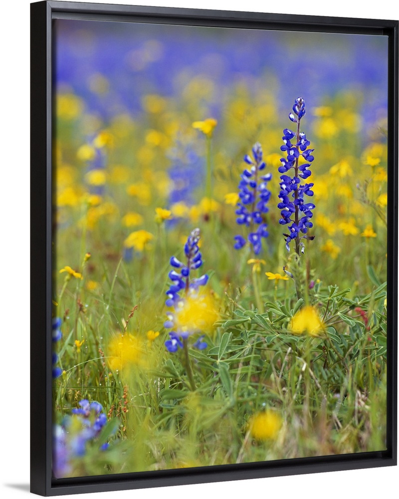 <p>Large, vertical photograph of blue bonnets and wildflowers in a meadow. One flower in the foreground is in focus while the rest of the image is a soft focus or blur.</p>