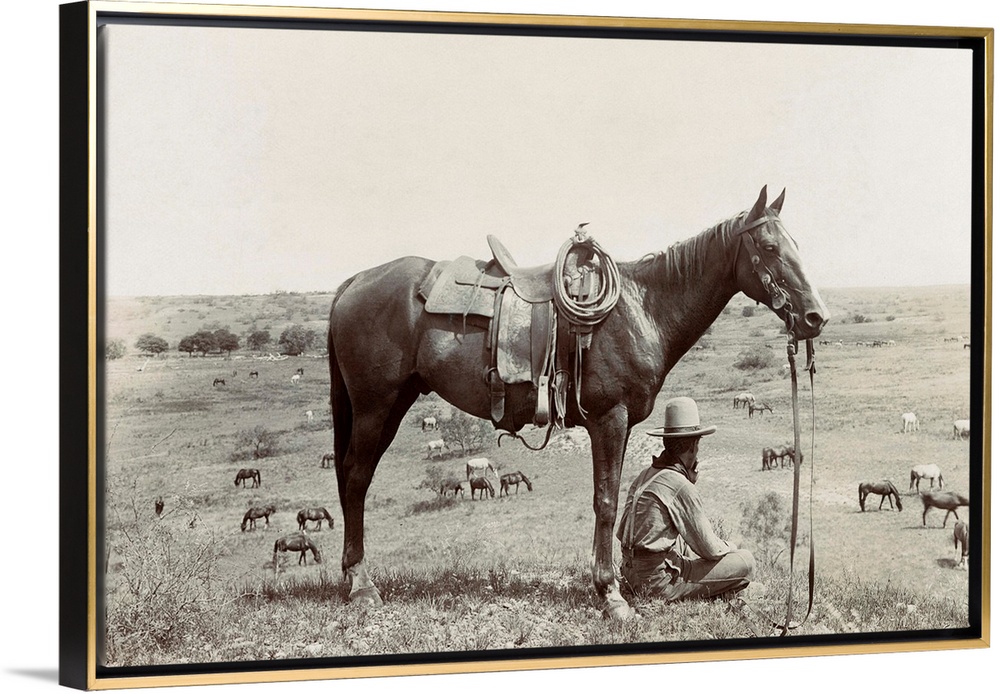 <p>Texas, Cowboy, C1910. A Horse Wrangler Seated Next To His Horse On A Hill And Looking Down At Other Horses Grazing In A Field In Texas. Photograph By Erwin Evans Smith, C1910.</p>