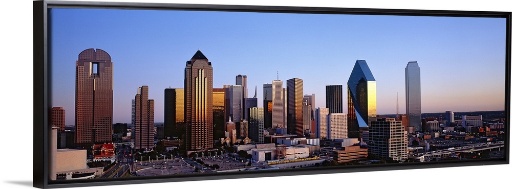 <p>Oversized, panoramic photograph of the Dallas skyline at sunrise.</p>