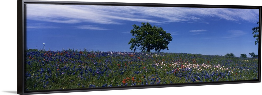 <p>Lone tree stands tall in the center of a flat field dotted with wildflowers, including bluebonnets.</p>