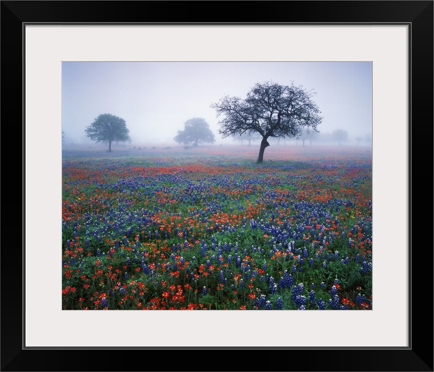 <p>USA, Texas, Hill Country, View of Texas paintbrush and bluebonnets flowers at dawn.</p>