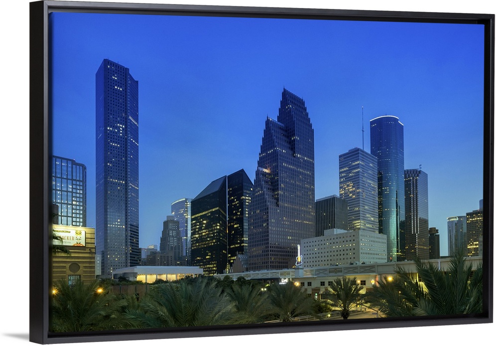 <p>Texas, Houston skyline from the Downtown Aquarium at dusk.</p>