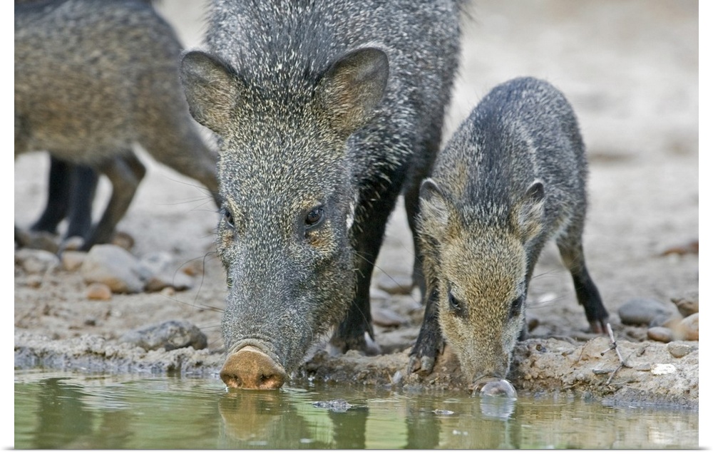 <p>Texas, Rio Grande Valley. Javelina adult and juvenile drinking at water hole.</p>