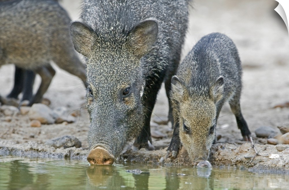 <p>Texas, Rio Grande Valley. Javelina adult and juvenile drinking at water hole.</p>