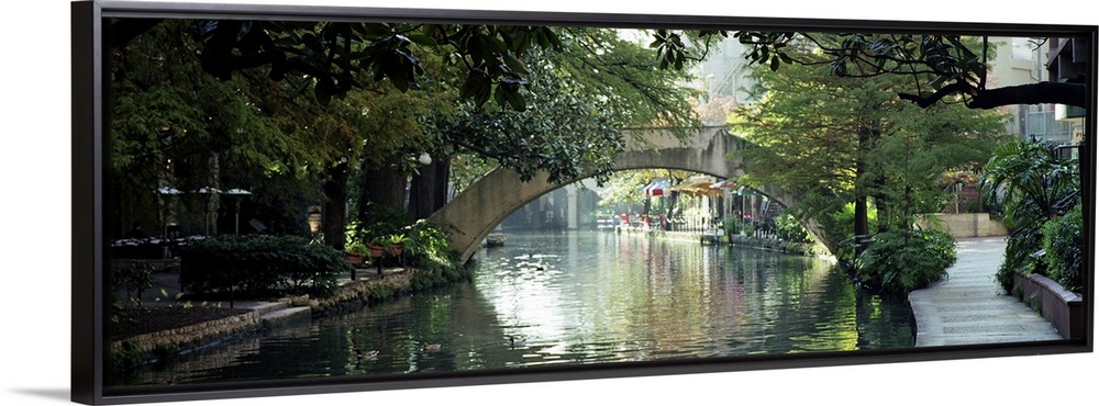 <p>Panoramic image of the canal in San Antonio with sidewalks, trees, and restaurants lining the water and an arched foot bridge spanning the water.</p>