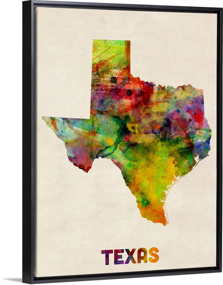 <p>Contemporary piece of artwork of a map of Texas made up of watercolor splashes.</p>