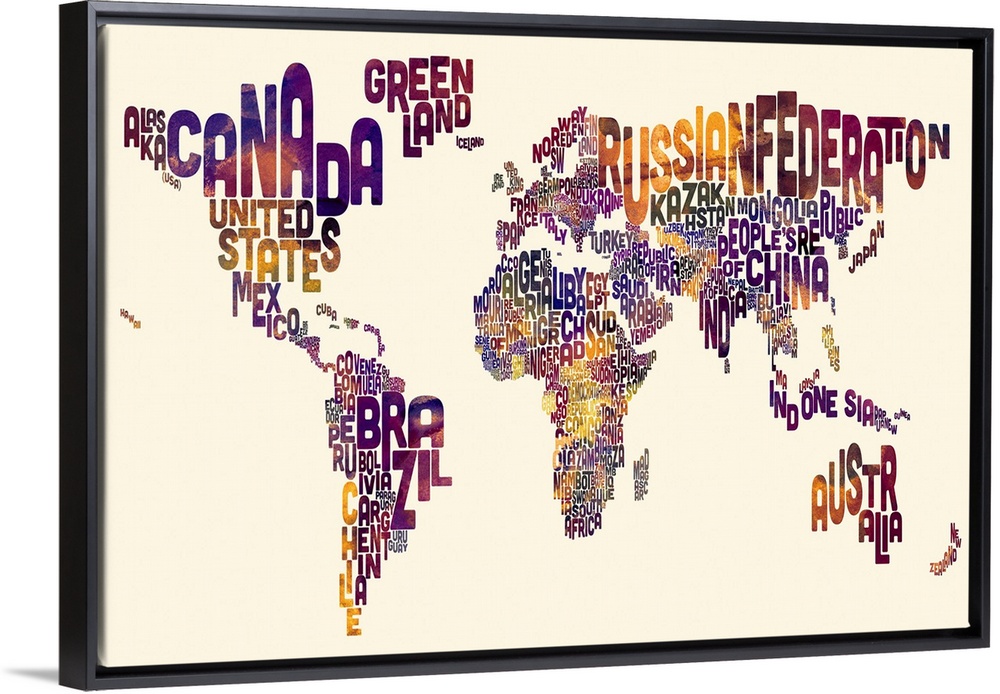 <p>Contemporary typography world map artwork. The name of the country makes up its shape.</p>