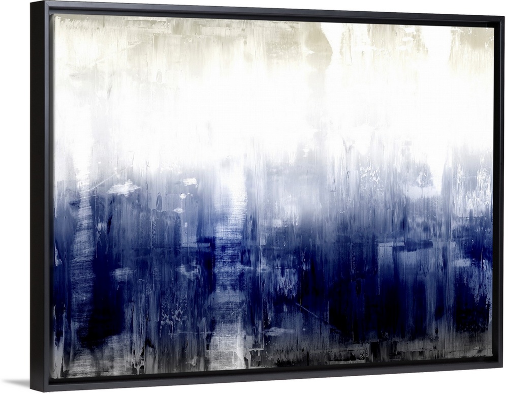<p>Large abstract painting with deep shades of blue and black at the bottom and lighter hues of gray and white streaking through.</p>