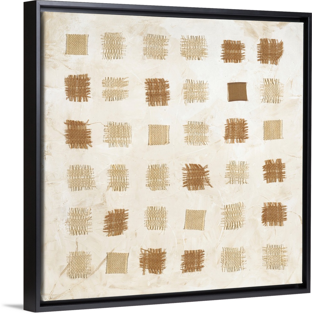 <p>Textural artwork featuring a grid of woven fabric patches in earthy tan and brown tones on a cream background, emphasizing natural materials and rustic simplicity.</p>