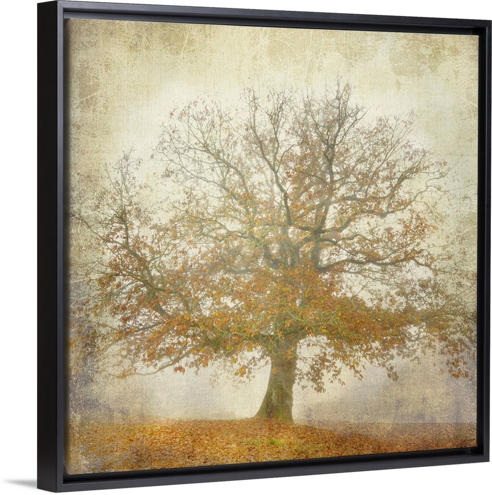 <p>Square orange and yellow graphic work of a textured oak tree picture at fall with lots of orange leaves on the ground.</p>