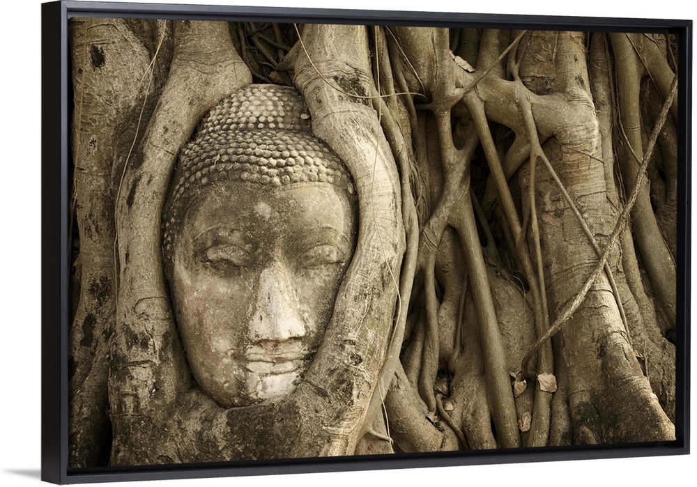 Thailand, Ayutthaya, Buddha head embedded in tree roots, Wat Mahathat