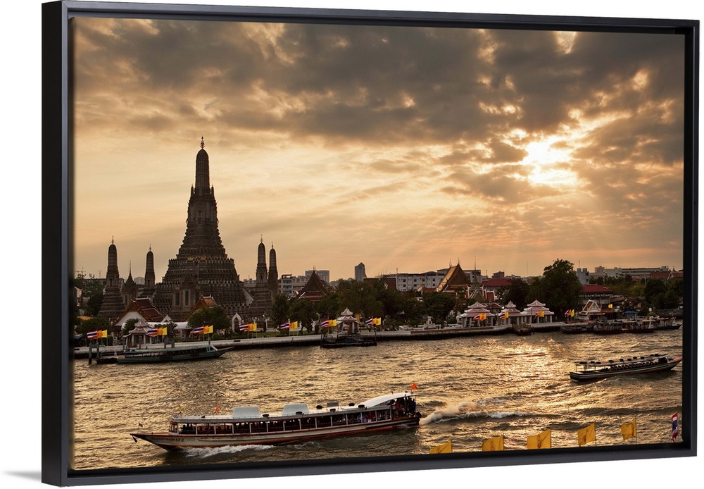 <p>Thailand, Thailand Central, Bangkok, Wat Arun, Sunset over the Wat Arun (Temple of Dawn) and the Chao Phraya river.</p>
