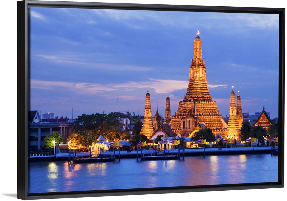 <p>Thailand, Thailand Central, Bangkok, Wat Arun, Temple of Dawn and the Chao Phraya river illuminated at night.</p>