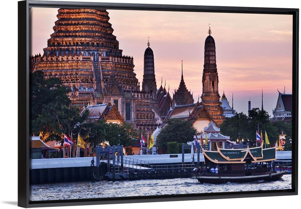 <p>Thailand, Thailand Central, Bangkok, Wat Arun, Temple of Dawn and the Chao Phraya river illuminated at night.</p>