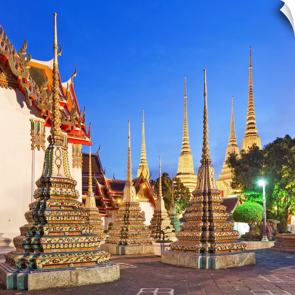 <p>Thailand, Central Thailand, Bangkok, Wat Pho, Temple of the Reclining Buddha illuminated at dusk.</p>