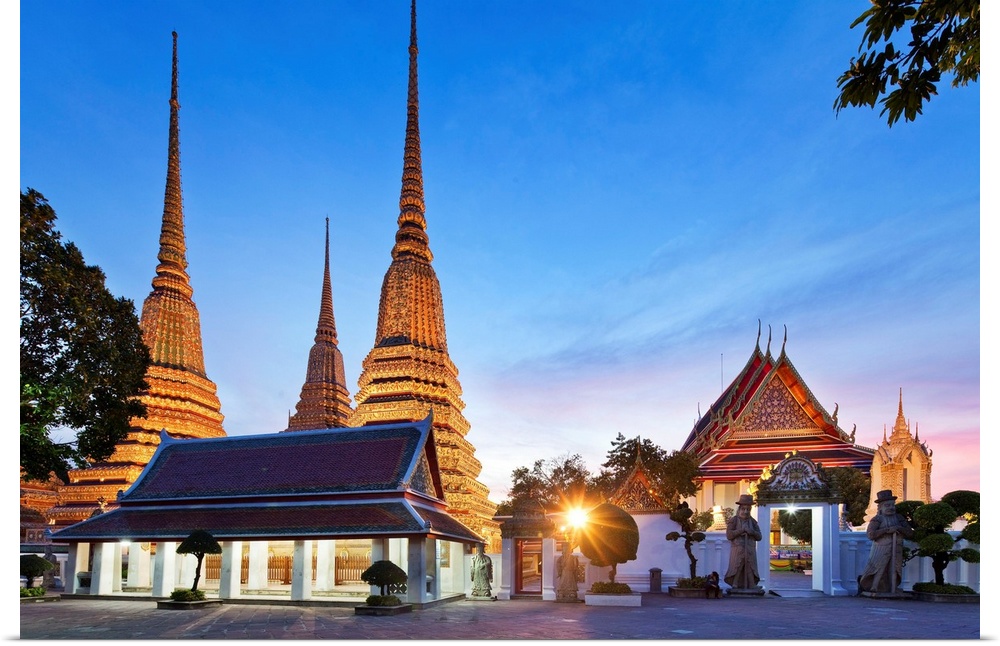 <p>Thailand, Central Thailand, Bangkok, Wat Pho, Temple of the Reclining Buddha illuminated at dusk.</p>
