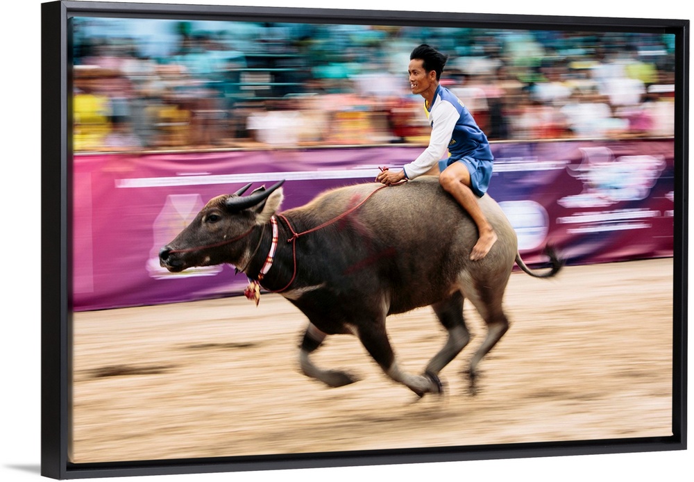 <p>Thailand, Thailand Central, Chonburi, Changwat, Chon Buri, Buffalo rider nearing the finish line, Chuonburi Buffalo Racing Stadium.</p>