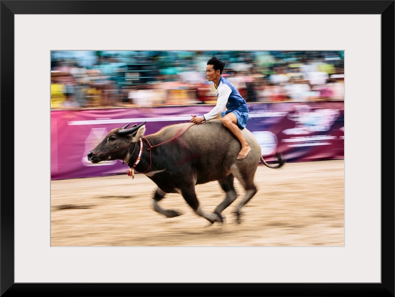 <p>Thailand, Thailand Central, Chonburi, Changwat, Chon Buri, Buffalo rider nearing the finish line, Chuonburi Buffalo Racing Stadium.</p>