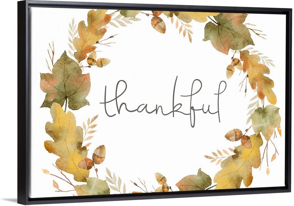 <p>Graphic holiday art with the word "Thankful" written inside an Autumn wreath made up of leaves and acorns.</p>