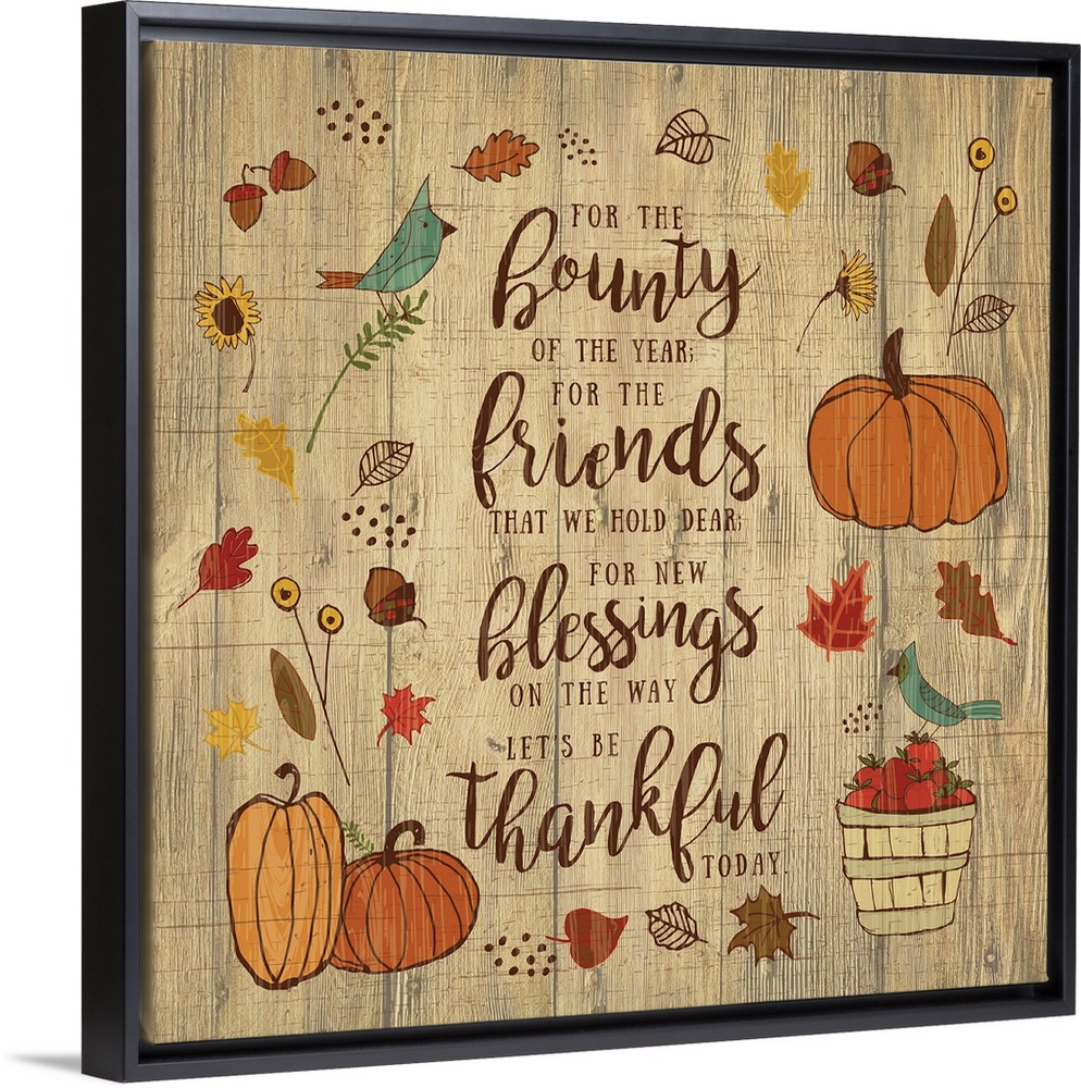 <p>Thanksgiving themed decor of pumpkins, leaves, and birds surrounding a thankful prayer.</p>