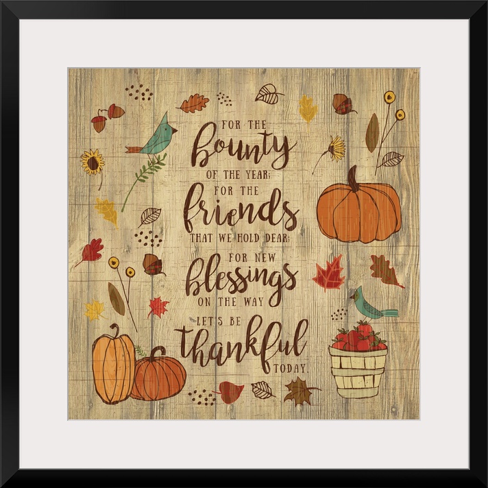 <p>Thanksgiving themed decor of pumpkins, leaves, and birds surrounding a thankful prayer.</p>