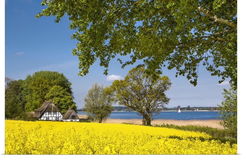 <p>Thatched house and canola field, Schlei fjord, Baltic coast, Schleswig-Holstein, Germany.</p>
