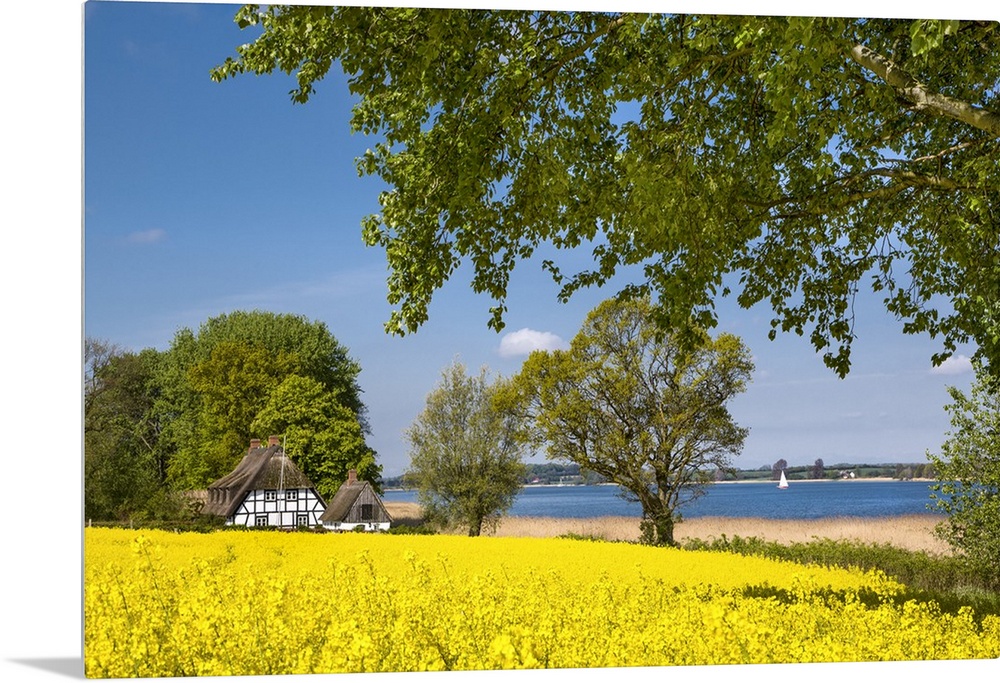 <p>Thatched house and canola field, Schlei fjord, Baltic coast, Schleswig-Holstein, Germany.</p>