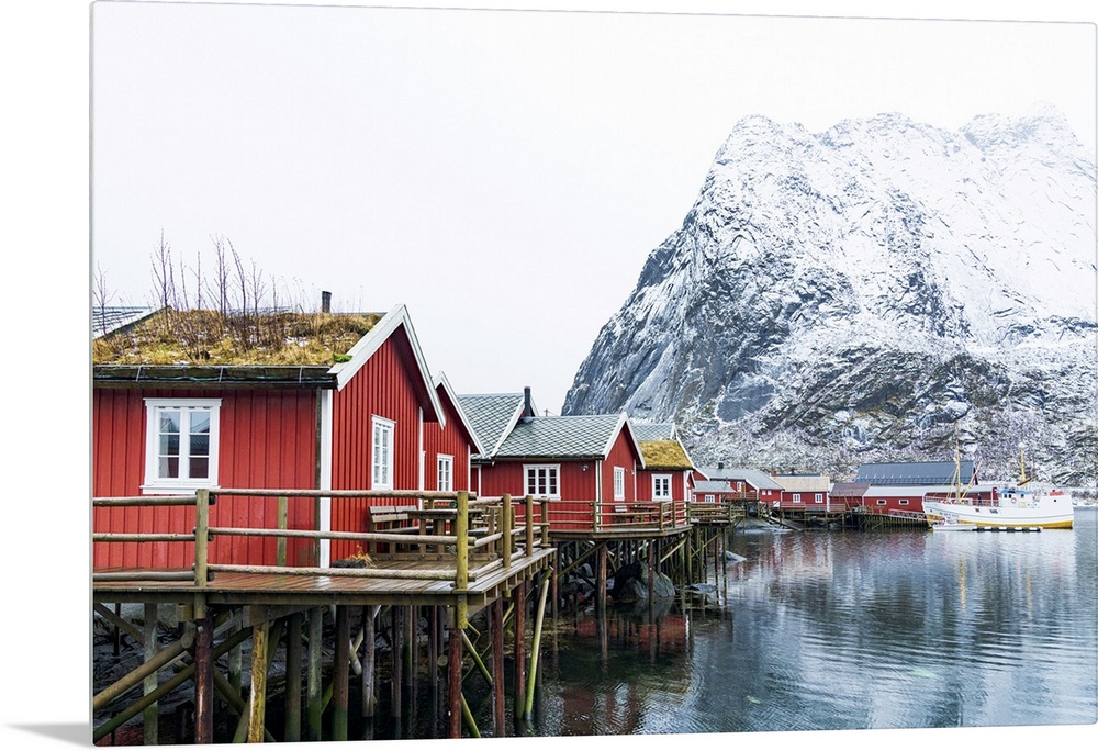 <p>Traditional thatched roofed red cabins with majestic Reinebringen mountain in the background, Reine port, Lofoten Islands, Norway, Scandinavia, Europe</p>