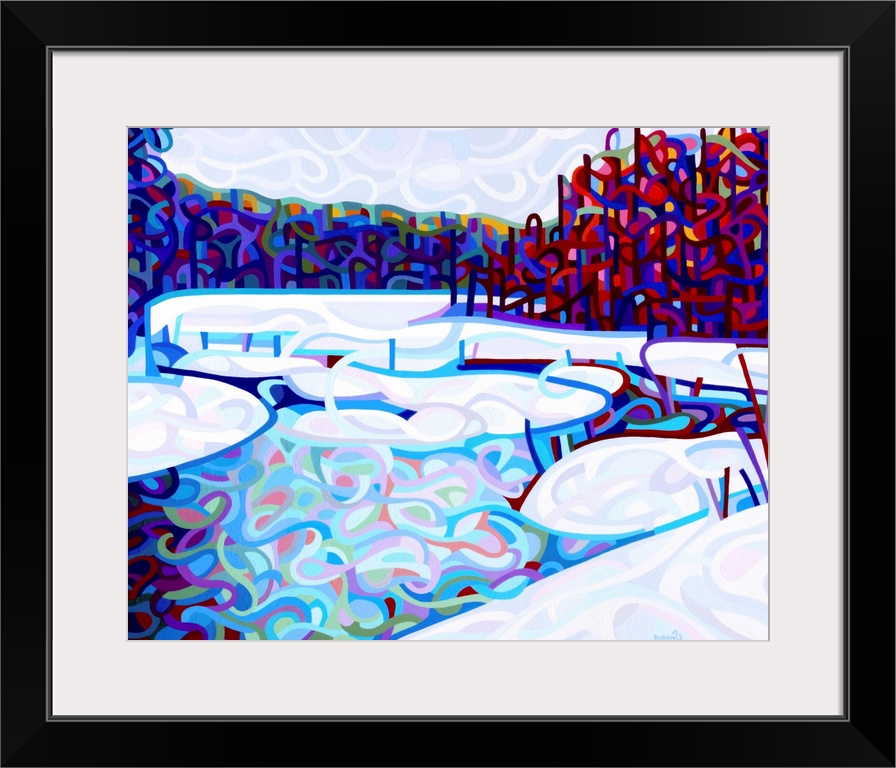 <p>Stylized contemporary painting of a frozen river in a forest with snowy banks.</p>