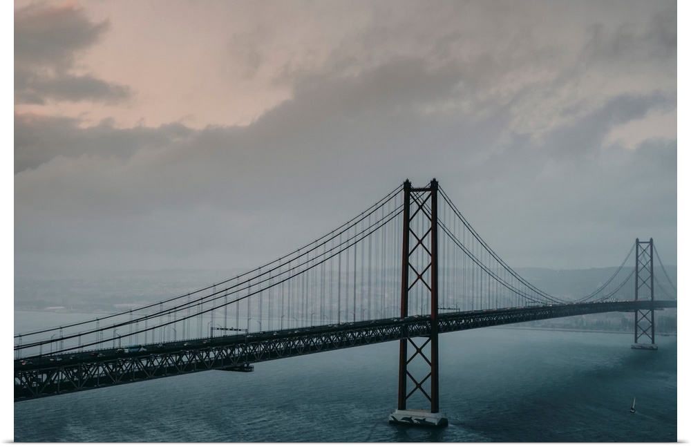 <p>The 25 de Abril Bridge crossing the Tagus River, connecting Lisbon and Almada on a grey, foggy day, Lisbon, Estremadura, Portugal</p>