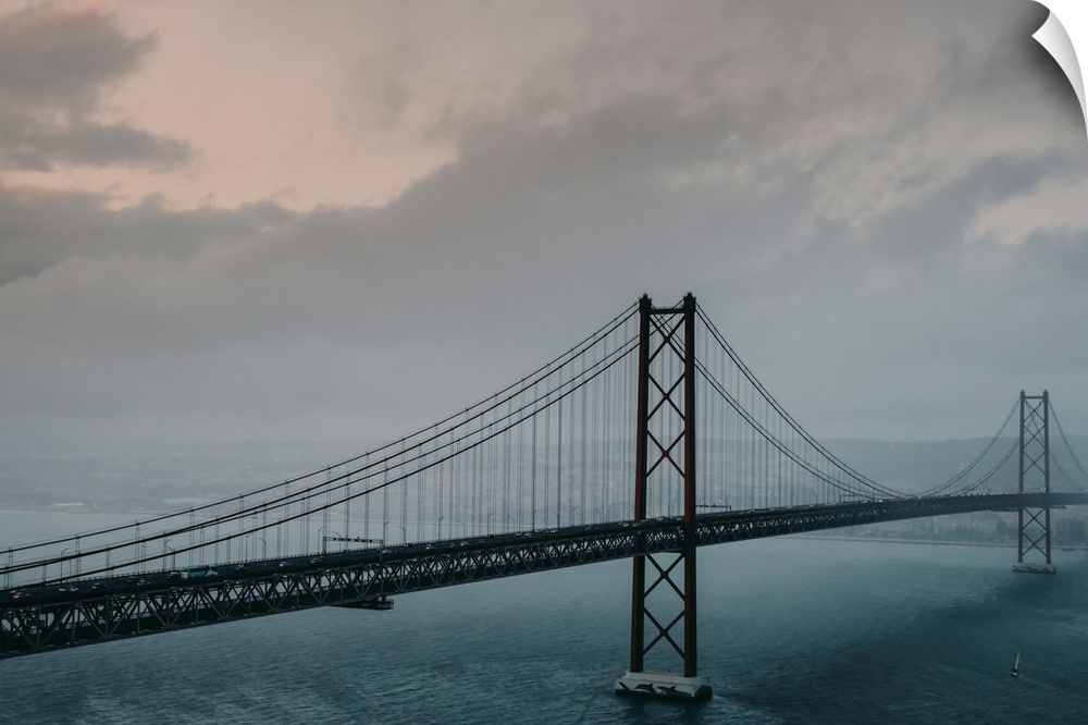 <p>The 25 de Abril Bridge crossing the Tagus River, connecting Lisbon and Almada on a grey, foggy day, Lisbon, Estremadura, Portugal</p>