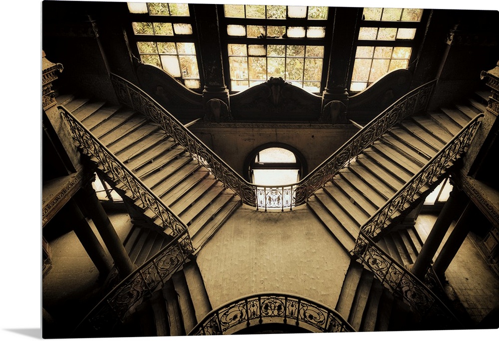 <p>Photograph of crossing interior stairways in an abandoned palace in Cairo.</p>