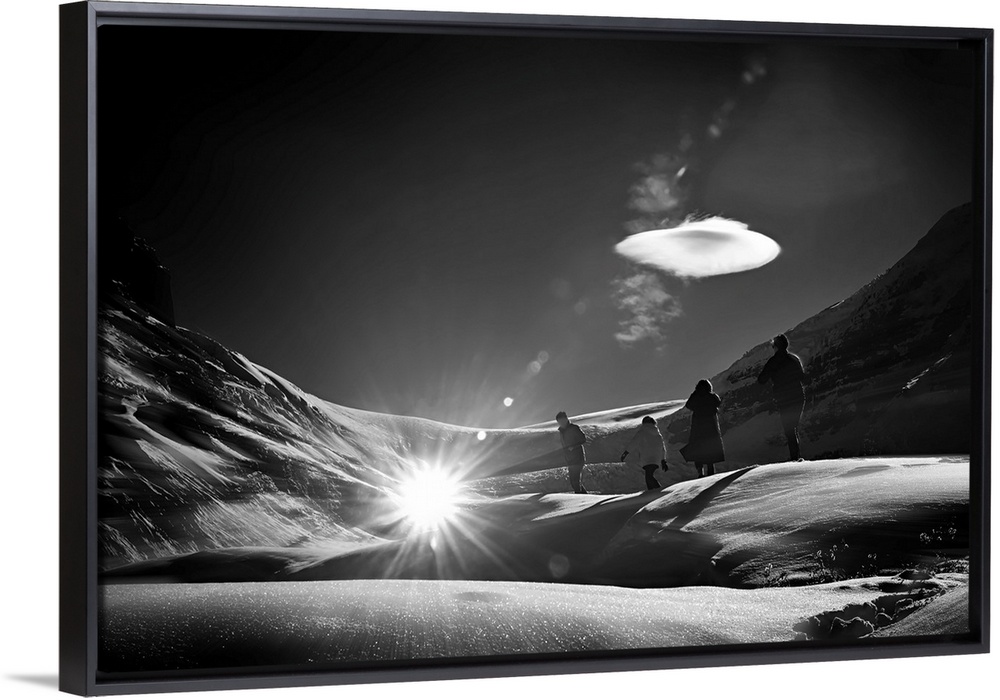 <p>A group of people on the Athabasca Icefield in Canada. The lone cloud looked like a spaceship. The people there looked like they were ready to be abducted by aliens. The added sunburst intensifies the story. Ursula Abresch Black and White Collection.</p>